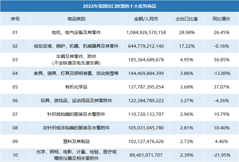 2022年我國出口歐盟的優(yōu)勢商品主要集中在電機、機械器具、車輛、家具燈具、有機化學品、玩具、服裝、塑料、儀器設(shè)備等品類。從數(shù)據(jù)情況來看,我國在化工原料及其相關(guān)產(chǎn)成品的貿(mào)易往來中占據(jù)重要地位。