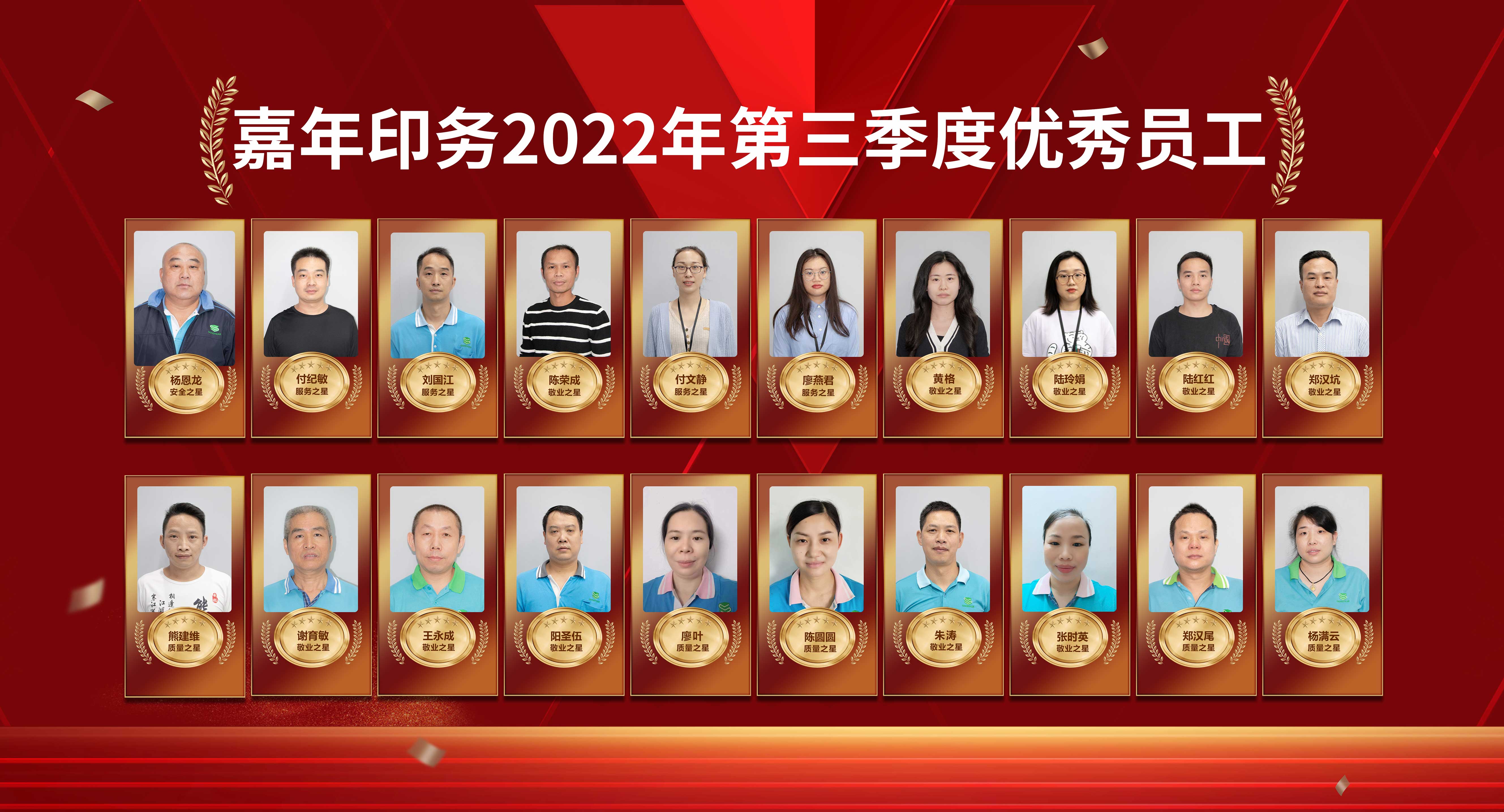 嘉年宛如一棵參天大樹,而員工則是這大樹的根系,是他們扎根基層 ,深入土壤,克勤克儉,才讓這棵大樹根深蒂固,枝繁葉茂,茁壯成長。2022年第三季度,我們團結一心、齊頭并進,期間涌現(xiàn)出一大批表現(xiàn)優(yōu)異的員工,他們是企業(yè)的主力軍,是企業(yè)文化的最好詮釋者,他們?yōu)槠髽I(yè)的發(fā)展提供了強大的動力。